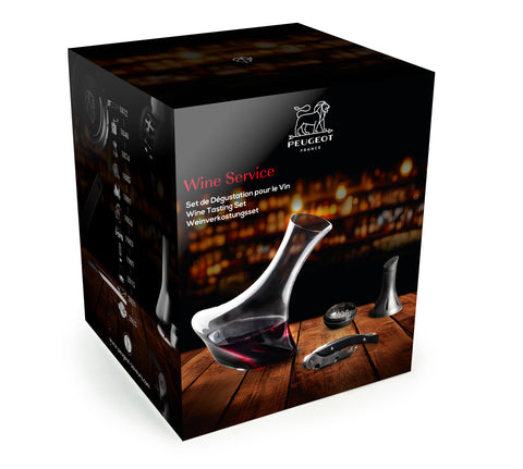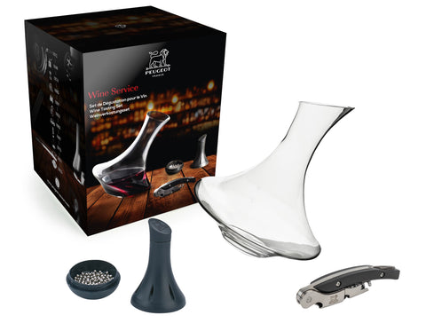 Dreiteiliges Set bestehend aus einem Dekanter, einem Kellnermesser und Reinigungsperlen (inkl. Trichter und Aufbewahrungsbehälter)