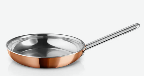 Die Pfanne verfügt über eine schöne Außenseite aus Kupfer und eine Innenseite aus glänzendem Edelstahl. Diese beiden Schichten umschließen einen Aluminiumkern – und diese einzigartige Kombination sorgt für eine außergewöhnliche Wärmeverteilung vom Boden und entlang der Seiten.